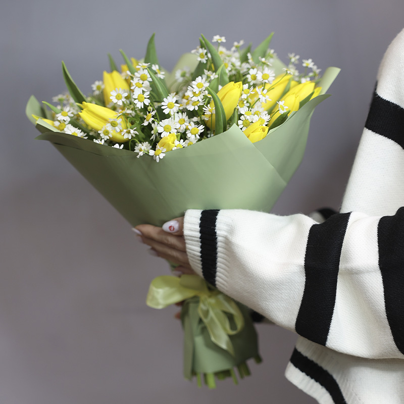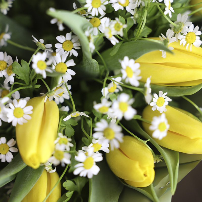 Букет из жёлтых тюльпанов и ромашек
