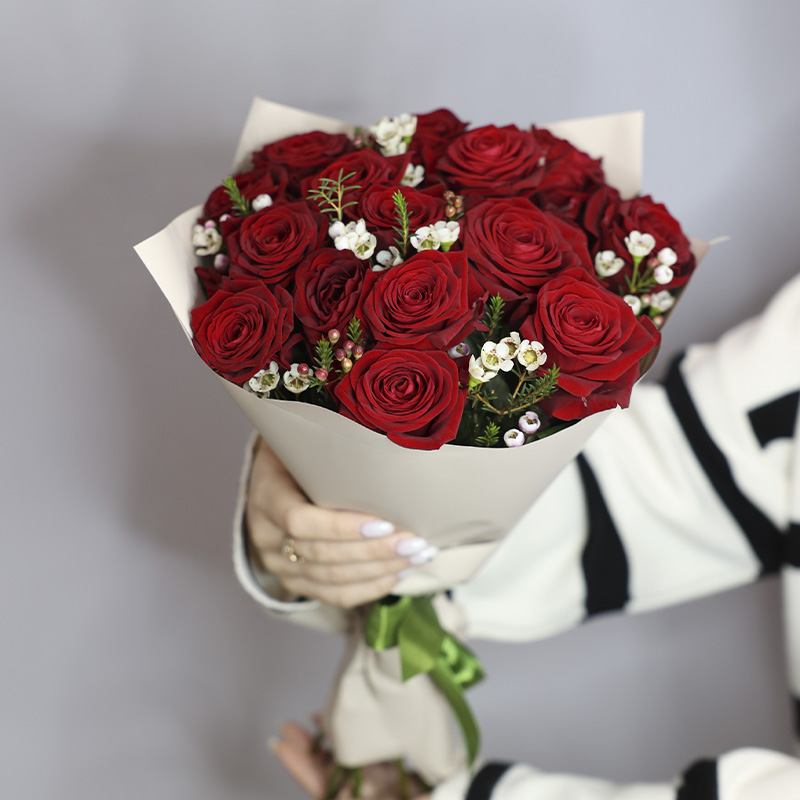 15 красных роз и шамелациум