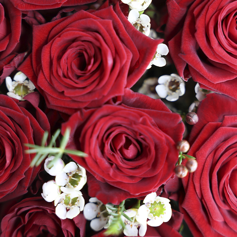 - Букет из красных роз и шамелациума