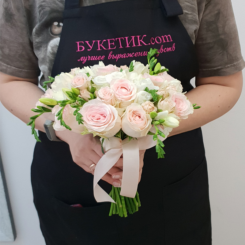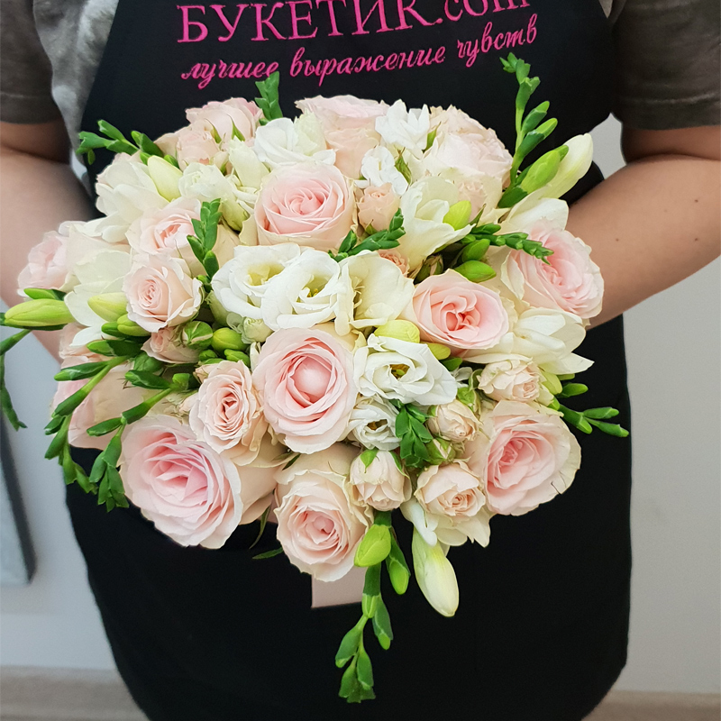 Роза нежно-розовая, фрезия белая, эустома белая